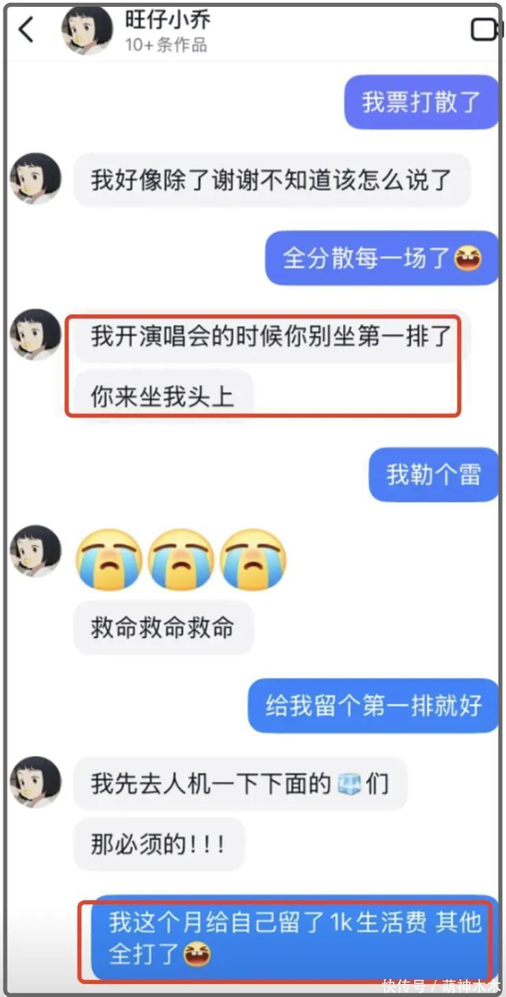 更让大哥心寒的是,在持续的充钱下,旺仔小乔感激涕零,说自己开演唱会的时候让大哥直接坐自己头上来看,虽然有点夸张,但是旺仔小乔还是承诺会给大哥留第一排的位置。结果到最后,演唱会也没看上。