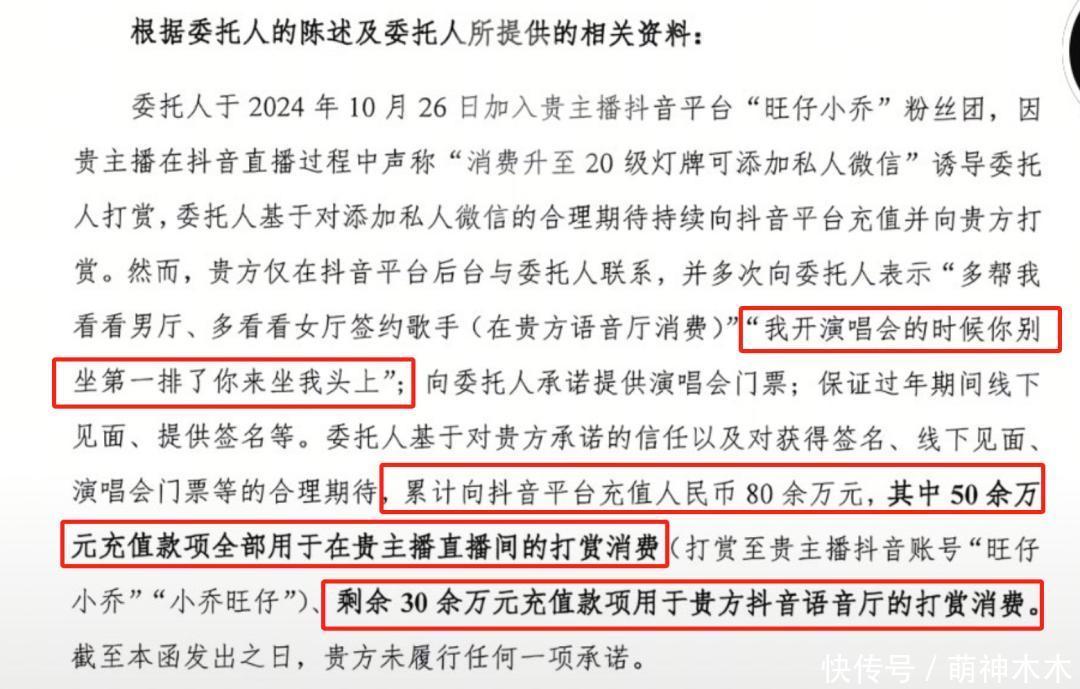 根据榜一大哥的律师函得知,他本人从去年11月份开始在旺仔小乔本人及旺仔小乔本人所开的语音厅,消费总金额超过人民币80万元,旺仔小乔通过频繁聊天虚构感情,承诺提供年度周边、签名、演唱会门票等其他内容,但最后无一做到。