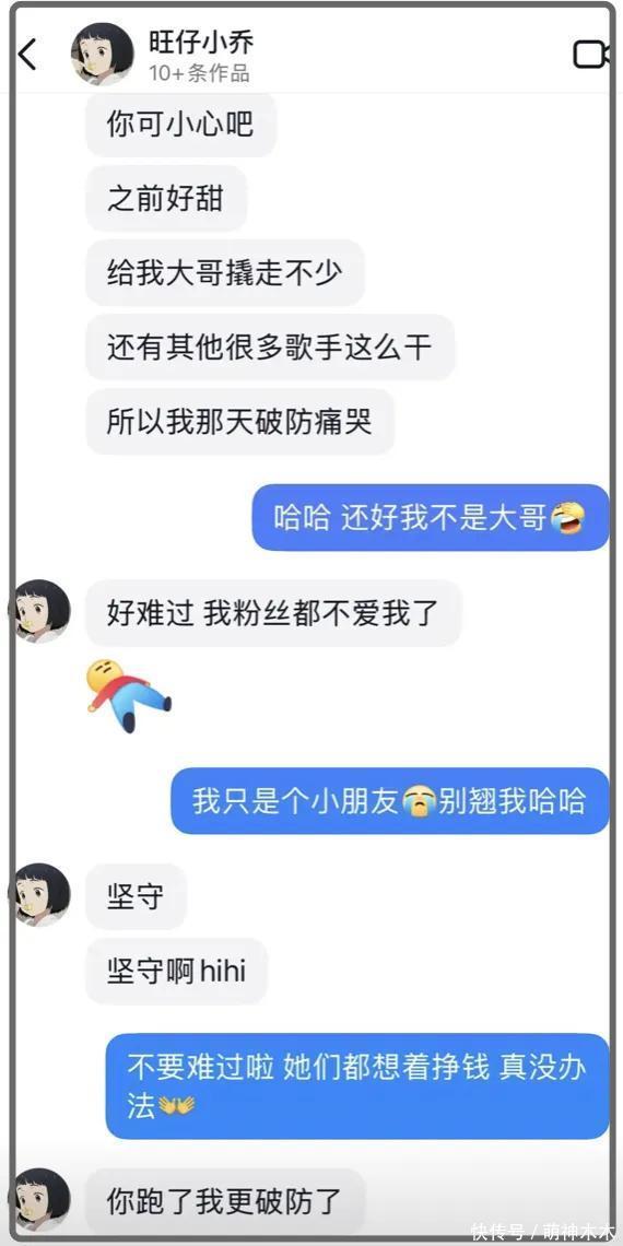不仅如此,在大哥上头期间,旺仔小乔还让大哥与其他粉丝们给自己家的签约歌手刷礼物,结果大哥照做之后,旺仔小乔又不开心了,说某某歌手都把自己的大哥们给撬走不少,让这位榜一大哥留点心眼,还想留住这位大哥,言语之间都是对这位大哥的依赖。