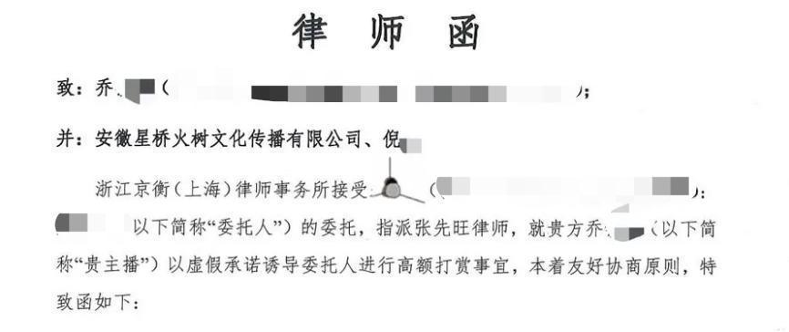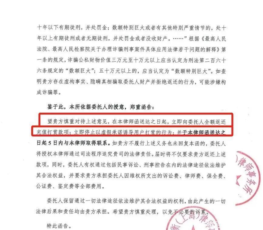 在旺仔小乔塌房后,鉴于旺仔小乔之前的行为,榜一大哥终于幡然悔悟,认为其存在欺诈性诱导消费行为,向旺仔小乔发律师函,要求返还全部充值打款项,并且立即停止虚假承诺诱导用户打赏的行为。