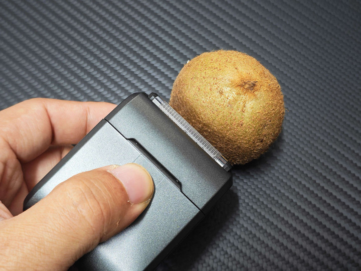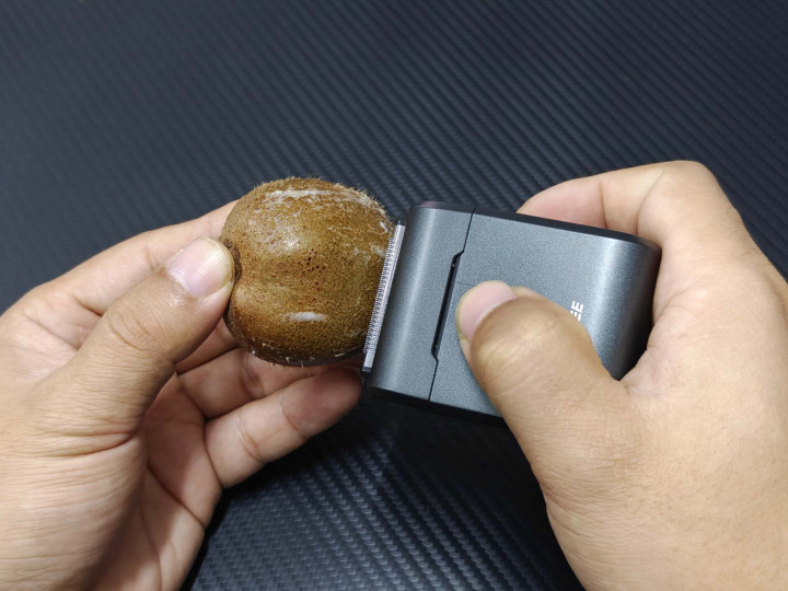拿了个猕猴桃进行测试,初始的时候猕猴桃上面的毛是非常细小的,并且覆盖非常全,在经过一会的剃须之后,剃须位置的毛几乎已经不见了,通过抖落的毛毛可以看到,这波的剃须效果那真的是相当干净。