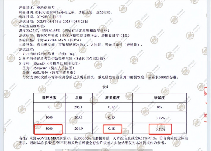 专业机构检测发现未野剃须刀5000次磨损刀片衰减度小于1%